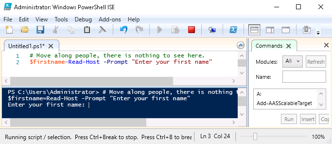 - $firstname = Read-Host -Prompt “Enter the user’s first name”