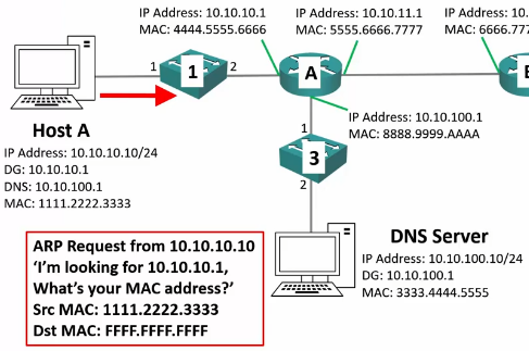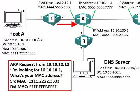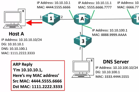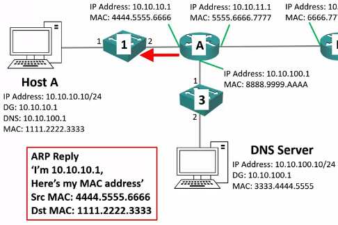- Host A will an entry for Router A mapping IP address 10.10.10.1 to MAC 4444.5555.6666 to its ARP cache.