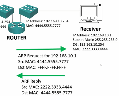 - Since the Router does not know the MAC address of the Receiver yet, it will hold the packet (frame??) and send an ARP request on the interface that connects to that network.