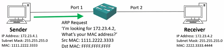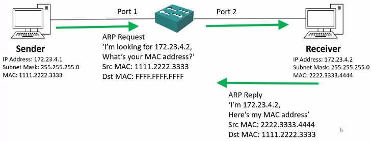 - Since this was a Unicast message and the switch already has the Sender’s MAC address (gathered from the original ARP), it only sends the reply to the Sender’s port.