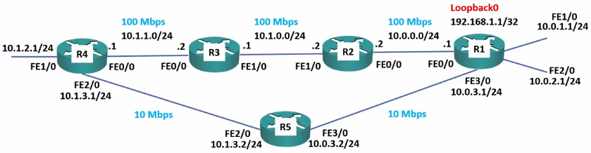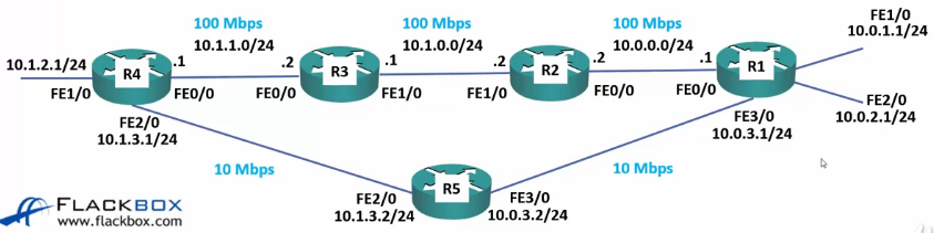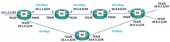 R1#show ip route 10.0.0.0/8 is variably subnetted, 12 subnets, 2 masks C 10.0.0.0/24 is directly connected, FastEthernet0/0 L 10.0.0.1/32 is directly connected, FastEthernet0/0 C 10.0.1.0/24 is directly connected, FastEthernet1/0 L 10.0.1.1/32 is directly connected, FastEthernet1/0 C 10.0.2.0/24 is directly connected, FastEthernet2/0 L 10.0.2.1/32 is directly connected, FastEthernet2/0 C 10.0.3.0/24 is directly connected, FastEthernet3/0 L 10.0.3.1/32 is directly connected, FastEthernet3/0 D 10.1.0.0/24 [90/30720] via 10.0.0.2, 00:20:01, FastEthernet0/0 D 10.1.1.0/24 [90/33280] via 10.0.0.2, 00:19:38, FastEthernet0/0 D 10.1.2.0/24 [90/35840] via 10.0.0.2, 00:19:38, FastEthernet0/0 D 10.1.3.0/24 [90/261120] via 10.0.3.2, 00:19:43, FastEthernet3/0 192.168.0.0/32 is subnetted, 5 subnets C 192.168.0.1 is directly connected, Loopback0 D 192.168.0.2 [90/156160] via 10.0.0.2, 00:00:40, FastEthernet0/0 D 192.168.0.3 [90/158720] via 10.0.0.2, 00:00:53, FastEthernet0/0 D 192.168.0.4 [90/161280] via 10.0.0.2, 00:01:07, FastEthernet0/0 D 192.168.0.5 [90/386560] via 10.0.3.2, 00:01:27, FastEthernet3/0