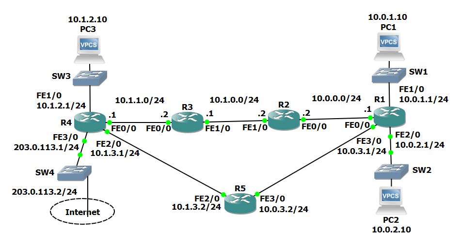 R3#sh ip int bri Interface IP-Address OK? Method Status Protocol FastEthernet0/0 10.1.1.2 YES NVRAM up up FastEthernet1/0 10.1.0.1 YES NVRAM up up FastEthernet2/0 unassigned YES NVRAM administratively down down FastEthernet3/0 unassigned YES NVRAM administratively down down