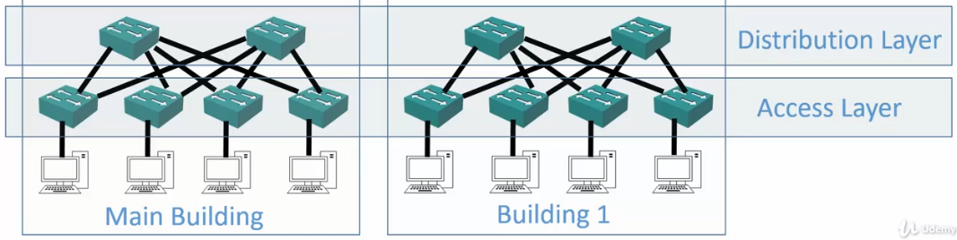 - Distribution Layer switches are typically deployed in redundant pairs, with downstream Access Layer switches connected to both.
