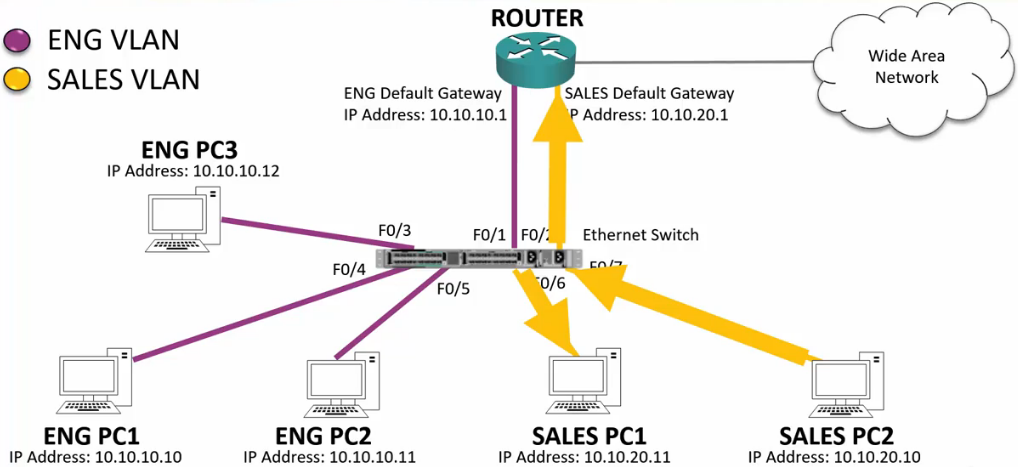 - It sees it has a port configured for the Sales VLAN and passes the frame through that port.