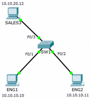 configure terminal vlan 10 name ENG int f0/1 switchport mode access switchport access vlan 10