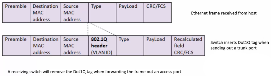 - When the switch forwards traffic to another switch, it tags the Layer 2 Dot1Q header with the correct VLAN