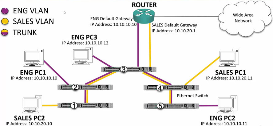 - Since there are no Sales VLANs available, it re-tags the header and passes the traffic through its trunk port to SW3.