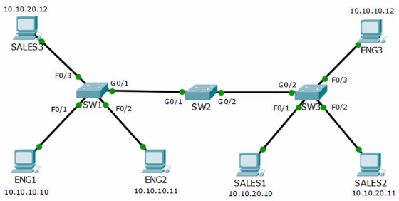 SW3#conf t SW3(config)#vlan 10 SW3(config-vlan)#name Eng SW3(config-vlan)#vlan 20 SW3(config-vlan)#name Sales SW3(config-vlan)#vlan 199 SW3(config-vlan)#name Nativ