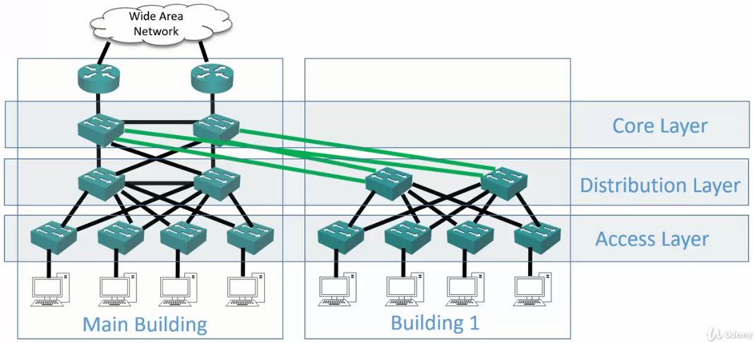 - Notice one pair of Core Layer switches vs. multiple pairs of distribution layer switches per building.