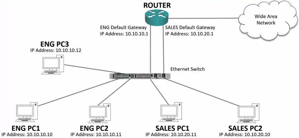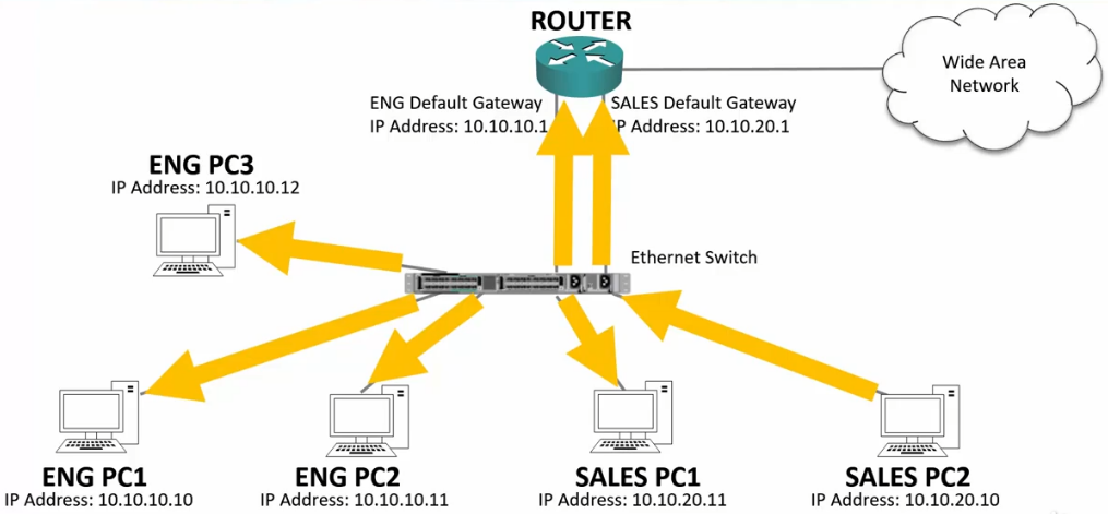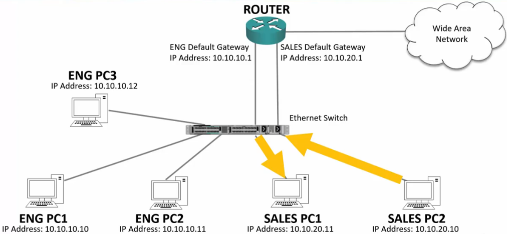 - The traffic will enter the switch, then to the Router because the Router’s IP is the default Gateway.