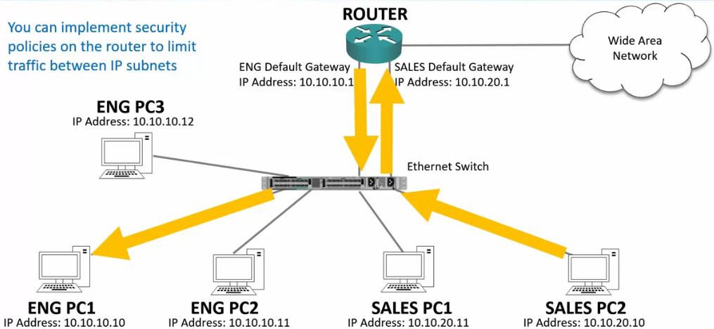 - Security rules on routers or firewalls can be used to easily control what traffic is allowed between different IP subnets at Layer 3.
