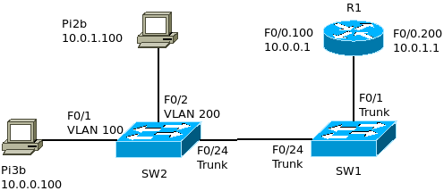 SW2(config)#interface fastethernet 0/1 SW2(config-if)#switchport mode access SW2(config-if)#switchport access vlan 100 SW2(config-if)#int f0/2 SW2(config-if)#switch mode access SW2(config-if)#switch access vlan 200