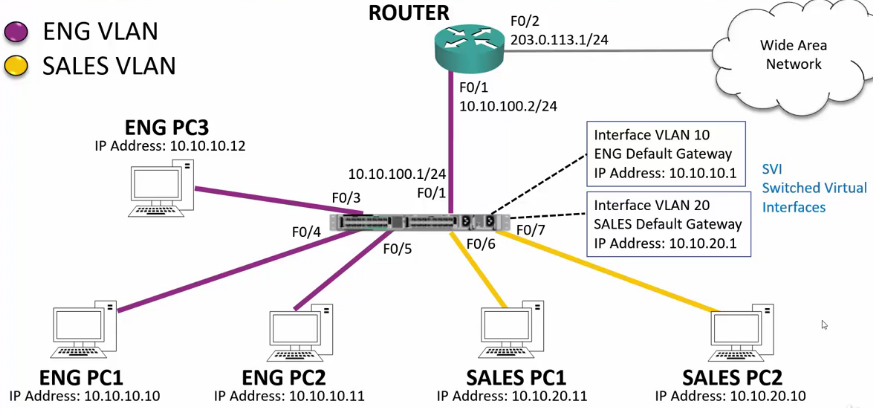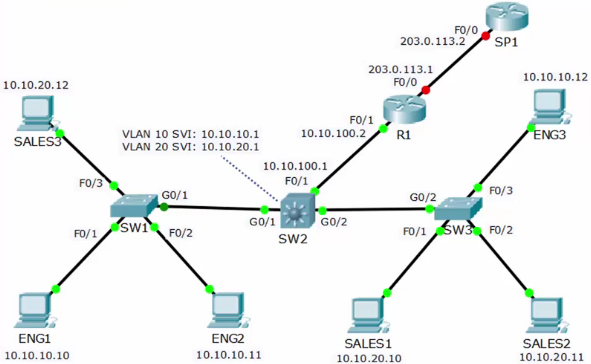 SW1(config)#interface fastethernet 0/1 SW1(config-if)#no switchport SW1(config-if)#ip address 10.10.100.1 255.255.255.0 SW1(config-if)#exit SW1(config)#ip route 0.0.0.0 0.0.0.0 10.10.100.2 R1(config)#! Configure Router R1(config)#interface fastethernet 0/1 R1(config-if)#ip address 10.10.100.2 255.255.255.0 R1(config-if)#no shutdown R1(config-if)#int f0/2 R1(config-if)#ip address 203.0.113.1 255.255.255.0 R1(config-if)#no shutdown R1(config-if)#exit R1(config)#! Configure Routes R1(config)#ip route 0.0.0.0 0.0.0.0 203.0.113.2 R1(config)#ip route 10.10.0.0 255.255.0.0 10.10.100.1