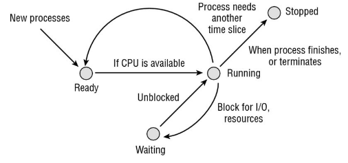 38. In what state does a processor’s scheduler place a process when it is prepared to execute but the CPU is not currently available?