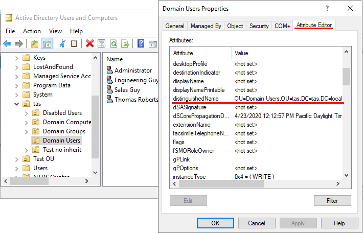 - AD > … > Domain Users [RtClk] > Properties > Attribute Editor > distinguishedName
