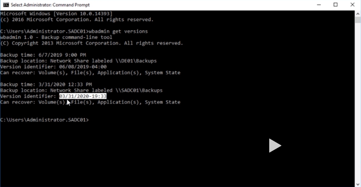wbadmin start systemstaterecovery -version:(version id) -authsysvol # wbadmin start systemstaterecovery -version:03/31/2020-19:33 -authsysvol # Confirm all notices
