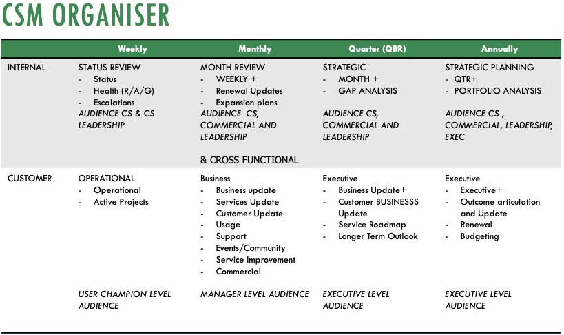 - For example, a CSM should ensuring they meet with their customers on operational issues weekly or monthly, on business issues monthly and on strategic quarterly.