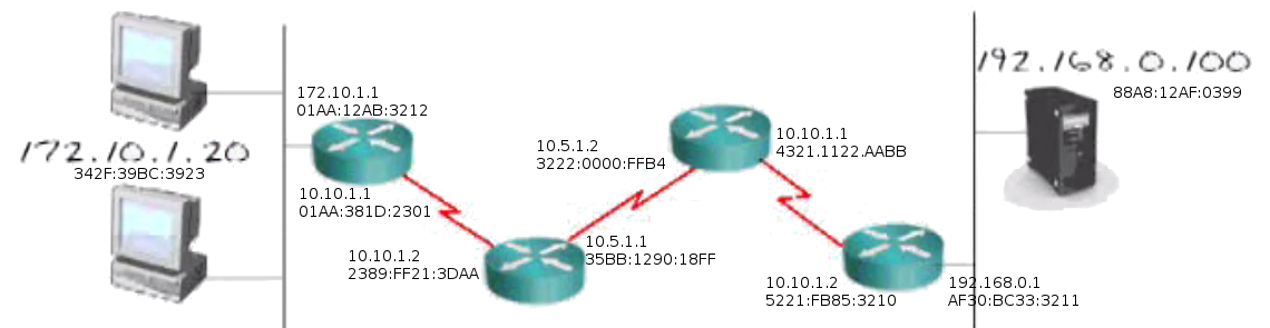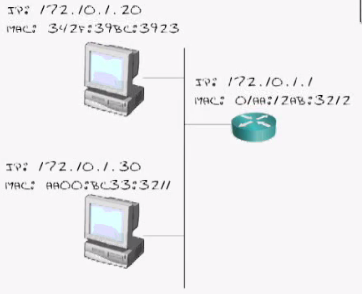 - .30 sees it is looking for its MAC, and sends it back to .20 “Hi, My IP address is 172.10.1.30 and my MAC address is AA00:BC33:3211”