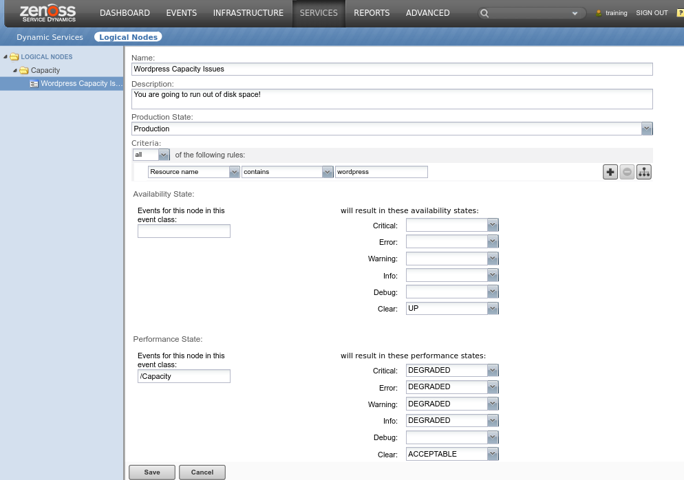 - When setting the Availability or Performance states, use the class (Availability or Performance) the event would fall under.