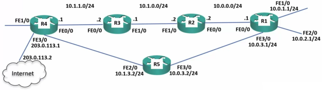 - From the 203.0.113.0 network (R4 FE1/0) to 10.0.1.0 network (R1 FE1/0)