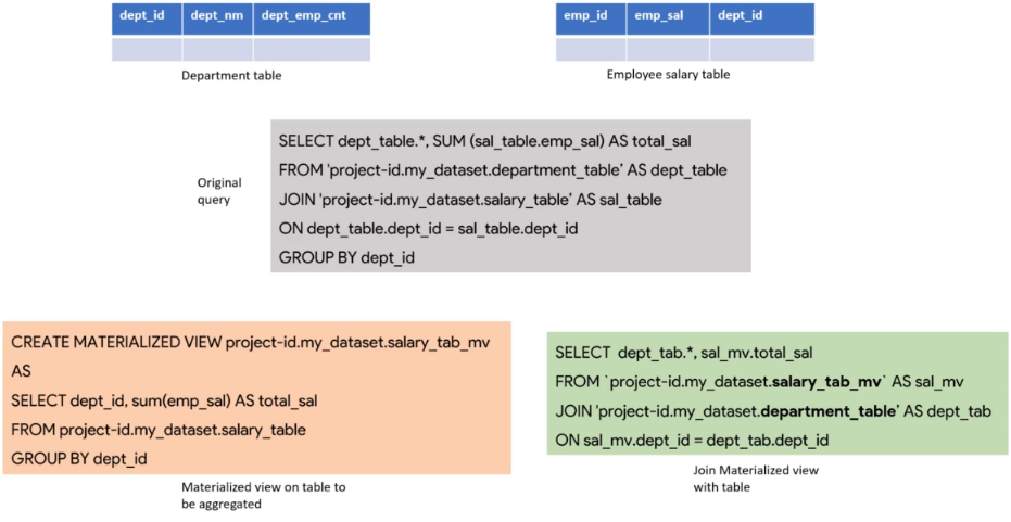 - If a query or subquery on a table can be served with an already created Materialized View, BQ reroutes the query to use Materialized view for efficiency.