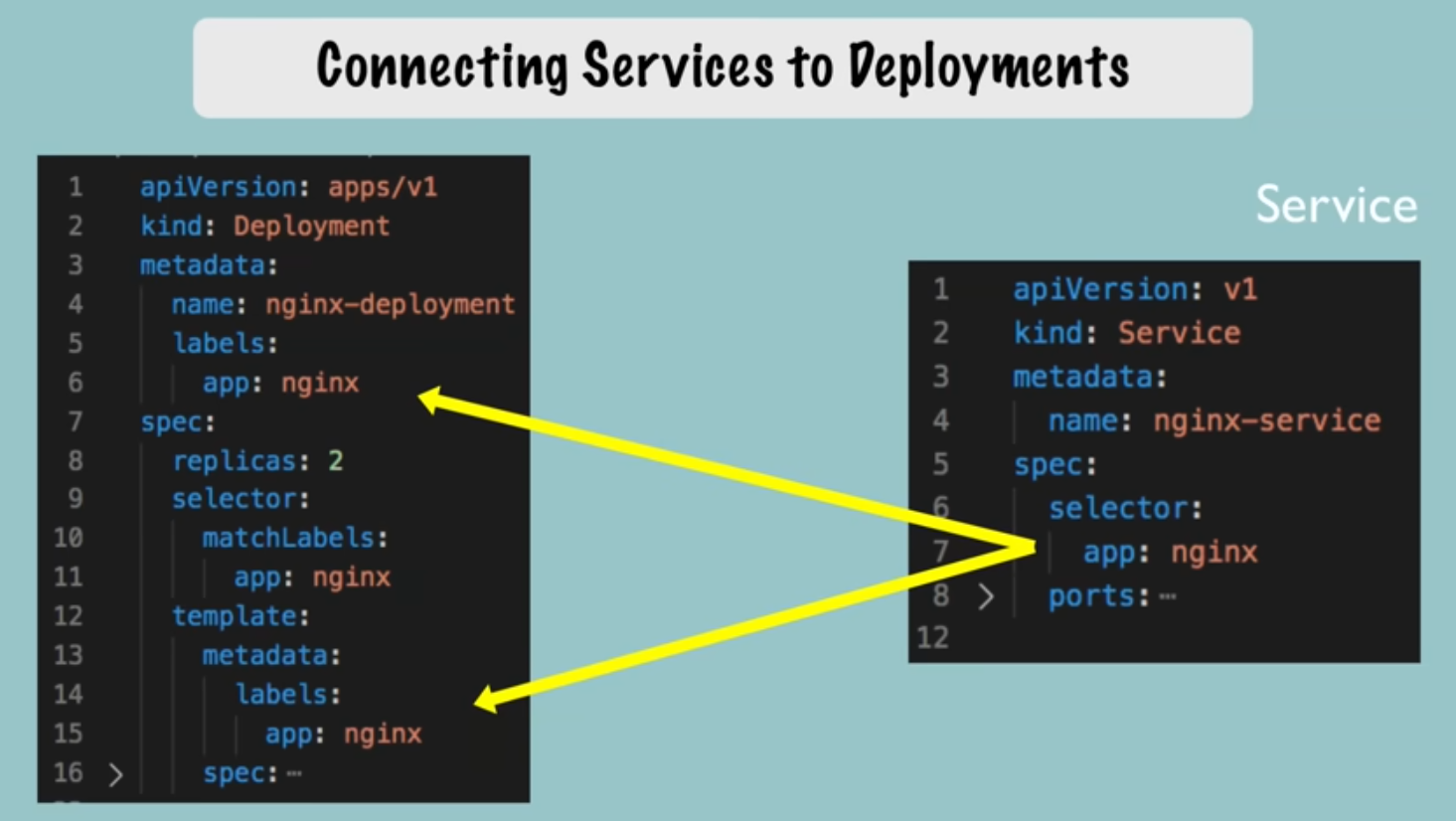- Think of a Service as a Load Balancer, with a static IP and Port.