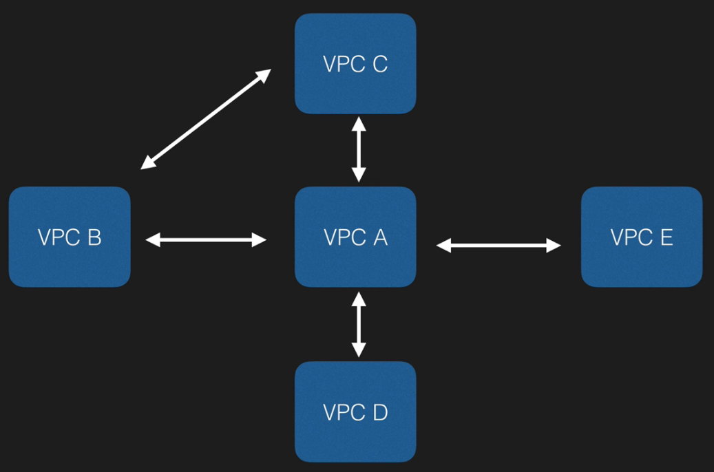 - Peering is in a star configuration, i.e. 1 central VPC Peers with 4 others. NO TRANSITIVE PEERING!!!