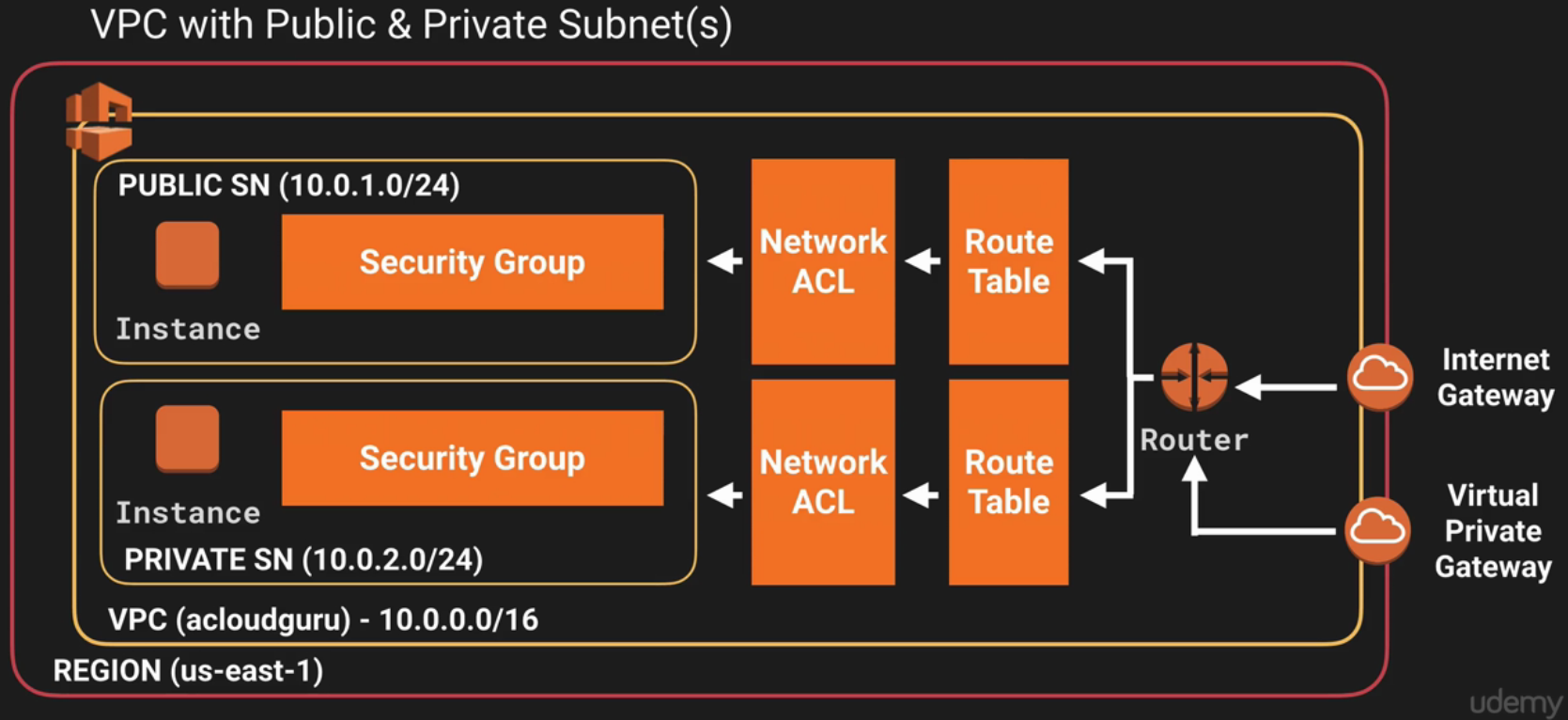 - Consists of Internet Gateways (IGWs, aka Virtual Private Gateways), Route Tables, Network Access Control Lists, Subnets and Security Groups.